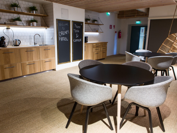 Dream Hostel & Hotel is known not only for its excellent location but also for its cleanliness, relaxed atmosphere, cheerful staff, and cozy common area. Board games, books, and magazines provide enjoyable pastime, and the hostel’s modern kitchen is at guests’ disposal for preparing breakfast and other meals. The fully equipped kitchen includes all the essential elements of a Finnish kitchen: an oven, stove, microwave, kettle, toaster, as well as necessary cooking utensils and dishes. The available coffee and tea can be freely prepared and enjoyed to brighten up mornings and evenings.