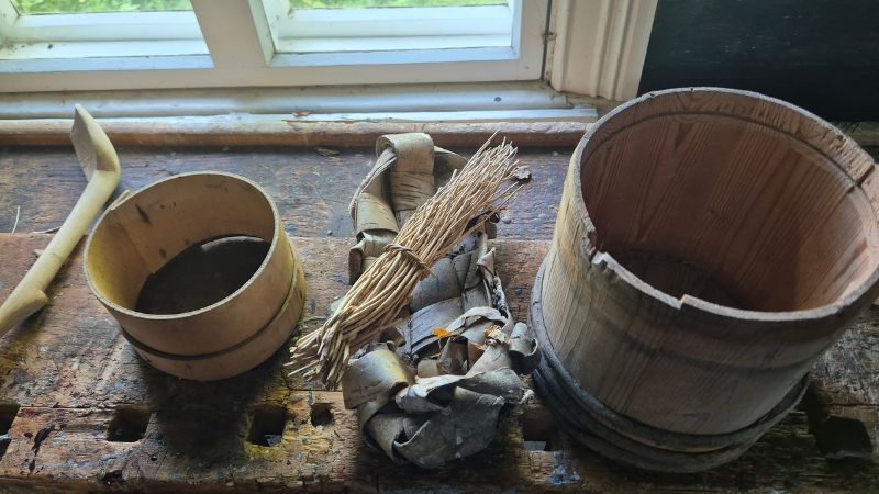 Perille päästyämme paistoi tietysti taas aurinko. Kävimme leirintäalueen kioskissa maksamassa ja hakemassa avaimen varaamaamme aittaan, jonne levittelimme saman tien tavarat kuivumaan. Jetikin oli melko märkä, mutta uuden paikan kiinnostavuus vei huomion protestoinnilta. Pienessä aitassa oli pirtin pöytä ja kerrossängyt neljälle hengelle, ja rapullekin saimme tavaroita kuivumaan. Aitan ikkunan äärestä löytyi Jetille mukava vahtipaikka. Kaiken kaikkiaan neljän hengen aittoja on viisi kappaletta ja niihin johtavat polut on tehty niin, että pyörätuolillakin pääsee. Tarvittaessa aitan sisäänkäynnille saa laitettua rampin.