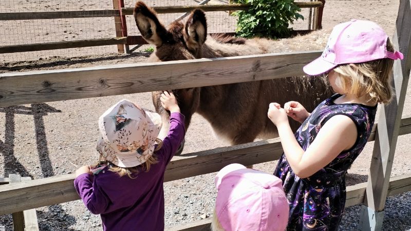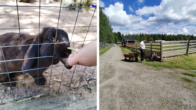 Lähdimme Porista jo aamulla ajatuksena käydä matkanvarrella Kiviniemen eläinpuistossa. Se oli sopivasti puolessavälissä matkaa. Eläinpuistossa meidän suosikkimme olivat ehdottomasti todella sosiaaliset ja persot puput sekä minipossut. Osaa eläimiä sai ruokkia voikukanlehdillä ja voikukilla mikä oli tietysti lasten mielestä parasta. Strutsin näkeminen oli meille kaikille ensimmäinen kerta. Puistossa oli eläinten lisäksi pomppulinnoja, trampoliineja, leikkipuisto, vaijeriliukua, keppihevosrata, mönkijäajelua ja polkuautoja. Viiden euron lisämaksusta pääsi poniajelulle. Puistoilun jälkeen käytiin vielä syömässä ja sen jälkeen olikin hyvä matkustaa ulkoilmasta ja touhusta väsyneiden lasten kanssa kohti Hostel Vekotinta.