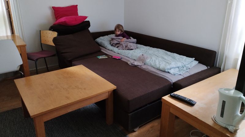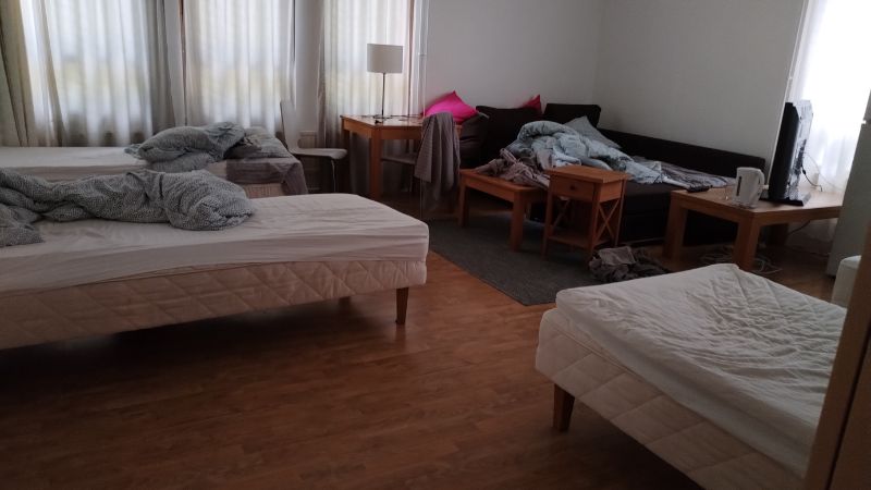 Hostel Vekotin sijaitsi omassa rauhassa hiekkatien varrella. Siellä oli piha, jossa oli pöytäryhmiä ja grilli. Kun päästiin huoneeseen, huomasin heti, kuinka tilava huone oli ja se oli todella positiivista. Sängyt olivat kevyitä ja niitä oli helppo siirrellä oman mieltymyksen mukaan. Sängyt oli valmiiksi pedattu, kaapissa oli myös lisätyynyjä, joita emme tosin tarvinneet. Hostellissa ei ollut saatavilla vauvasänkyjä, mutta meillä ei ollut sille tarvettakaan. Lisäksi huoneessa oli vuodesohva ja n. 32 tuumainen tv vuodesohvan lähettyvillä. Nukkumisjärjestelyjä miettiessämme päätimme siirtää yhdeltä sängyltä petauspatjan vuodesohvalle, jotta minä ja mieheni voisimme nukkua vierekkäin. Näin saimme järjestettyä kaikki kolme lasta vierekkäisiin sänkyihin.