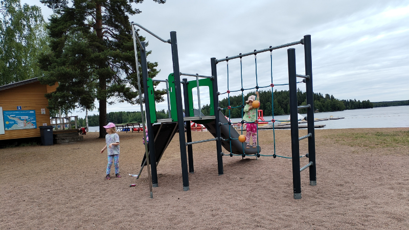 Toijalan satama oli todella positiivinen kokemus. Meidän lasten ikähaitari on niin suuri, että paikkoja missä kaikki viihtyisivät ja voisivat tulla mukaan, ei ole ihan älyttömän paljon, kun ikähaitari on leikki-ikäisestä teiniin. Tästä paikasta jäi kuitenkin sellainen olo, että joka ikäluokalle oli jotakin. Esteettömyys oli mielestäni hyvin huomioitu alueella. Satamasta löytyi liuskaa terassille, joka oli leveä ja myös pitkä. Kynnykset olivat matalia ja alueelta löytyi inva-wc. Golfradalle pääsi esteettömästi, kuten terassille, josta näki vesipuiston ja järven.