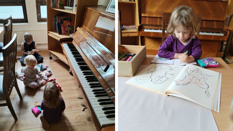 Aulassa lapset löysivät lelu-, kirja- ja piirtelypisteen sekä pianon nopeasti. Siellä kuluikin hyvin aikaa odotellessa uimahallivuoroa. Kello 18.00-19.15 meillä oli uintivuoro ja saimme täyttää uimapatjoja ja leluja sillä välin, kun lapset touhusivat leikkipisteellä. Uima-altaalla oli tilava pukuhuone ja suihku ja tilat olivat esteettömät. Sauna oli tilava ja sinne olisi päässyt suihkutuolin kanssakin, lapsilla oli hyvin tilaa vesileikkeihin toiseksi alimmalla lauteella.
