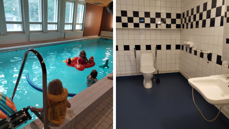 Perhehuoneessa oli viisi sänkyä, ja yhteisistä tiloista löytyi uima-allas ja sauna, jotka sai varattua yksityiskäyttöön tunnin ajaksi. Koimme sen isona plussana. Uimahallin yhteinen vuoro oli 21–22.00, mutta koska meillä oli mukana kolme nuorimmaista ikähaitarilla 2 v, 3 v ja 6 v päädyimme varaamaan yksityisvuoron aikaisemmin.