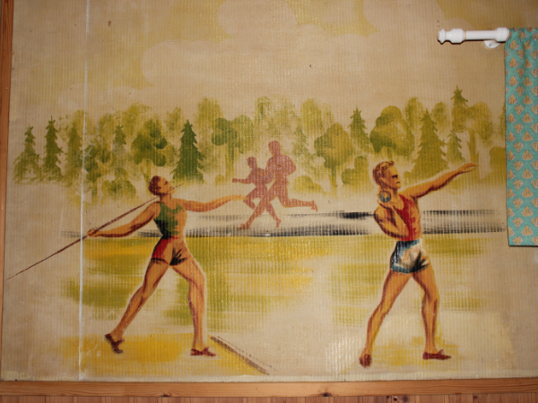 Kahvilan seiniä koristavat Aatos Hasun ja Veikko Lampisen maalaamat urheiluaiheiset seinämaalaukset. Ainutlaatuiset maalaukset ovat vuodelta 1952.