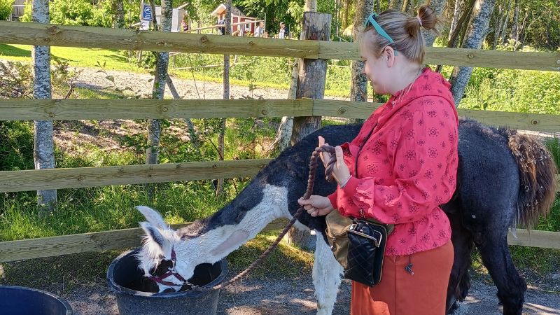Ajoimme porukalla Pohjanmaalle jo keskiviikkona, mutta reissumme lähti täysillä käyntiin vasta perjantaina. Päivästä oli povattu tuulista ja pilvistä säätä, ja ulkona olikin vain 12 astetta (perinteinen kylmä juhannussää), jolloin uskalsimme ottaa koiran jo heti mukaan autoon odottamaan. Aamumme alkoi Aava Kertun kotitilalla Mustasaaressa (Korsholm), jossa tutustuimme Annin kanssa tilan eläimiin ja kävelytimme laamoja. Tila on järjestänyt alpakkakävelyitä jo pidempään, mutta saimmekin kunnian toimia laamojen, Lucky Luke ja Red Bull, ensimmäisinä asiakaskävelyttäjinä.