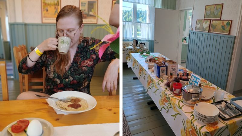 Juhannuslauantaina nautimme Opintolan herkullisen aamupalan. Meille oli kerrottu, että eräs singaporelainen vieras oli täysin ihastunut puuroon ja kysynyt, miten näin herkullinen puuro tehdään. Tämän myötä hän oli päässyt oppiin keittiön puolelle perheen tyttären eli Opintolan keittiömestarin kanssa! Puuroa oli siis pakko testata tämän tarinan jälkeen, ja tottahan se oli, puuro vei kielen mennessään, etenkin kun siihen laittoi talon rouvan itse tekemiä hilloja päälle. Merikarvialla syödessämme kasvisvaihtoehtoja ei perunan lisäksi ollut, mutta Opintolan aamiaispöydässä löytyi vaihtoehtoja niin seka- kuin kasvissyöjälle. Lisäksi kuulimme vinkin, että vegaanivaihtoehtoja löytyy kysyttäessä.