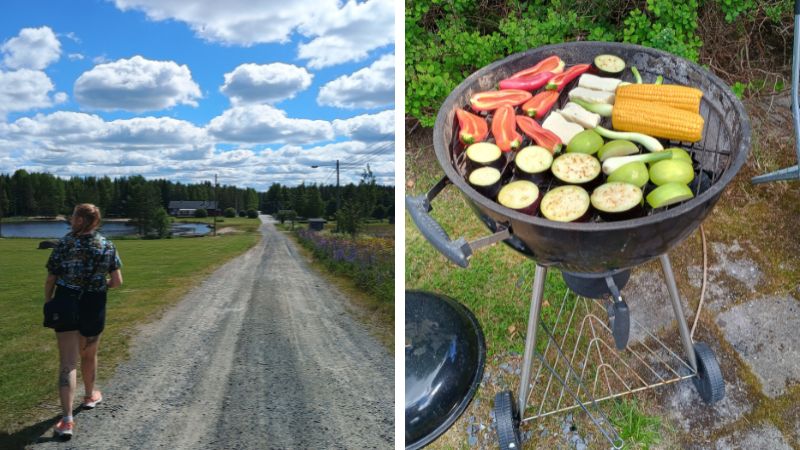 Parran vierailumme jälkeen vietimme iltapäivää grillaillen Opintolassa. Pidimme pienen hengähdystauon, jonka jälkeen päätimme Parran uimalammesta inspiroituneina etsiä toisen uimapaikan. Järvi-Suomen kasvatille tuli yllätyksenä, että päädyimmekin pidemmälle kruisailuretkelle. Ensimmäisellä uimarannalla oli ääretön määrä matkailuautoja ja ihmisiä. Väentungoksen takia ajoimme aina Ilmajoen puolelle etsimään rauhallisempia pulikointivesiä. Kun talviturkki oli heitetty, suuntasimme kaupan kautta takaisin Opintolaan. Grillihammastamme oli jäänyt lounaasta kolottamaan, joten pistimme kakkoskierroksen herkkuja tulille. Loppuillan nautimme jutustellen Opintolan perheen kolmen sukupolven kanssa. Leeti-koira nautti pihassa vapaana juoksemisesta ja perheen nuorimman polven kanssa puuhaamisesta. Oli ihanaa, kuinka koira huomioitiin esimerkiksi vesiämpärillä ja sillä, että saimme laittaa pihan portit kiinni turvallista juoksentelua varten.