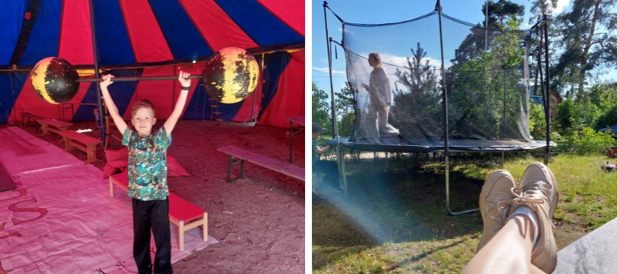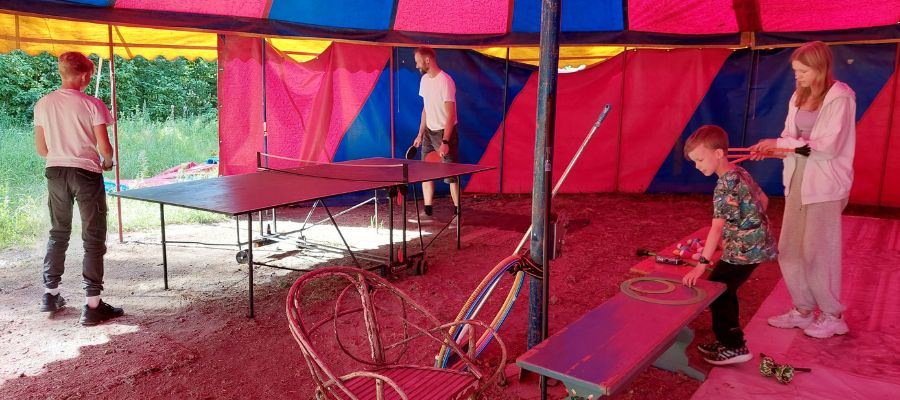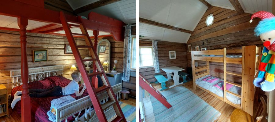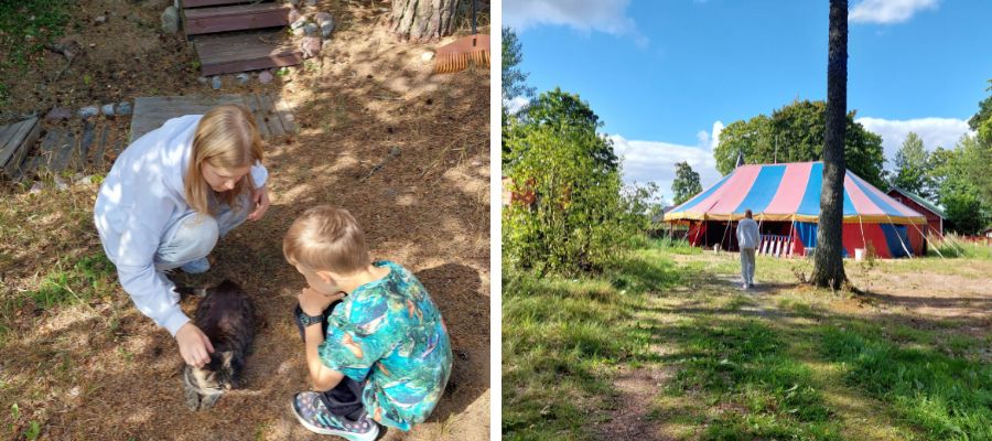 Paikka on kuin automaattisesti myös lasten mieleen, jos vain utelias mieli ja hoksottimet pelaavat. Pellentuvassa, jossa yövyimme, oli hirsisen vanhan aitan tunnelmaa mutta samalla parisängyn punaiset pylväät viimeistelivät punaisen makuuparven jalkoina paikan hengen. Lapset asiaan kuuluen niissä sitten riekkuivatkin (ei kerrota kelleen). Trampoliinin lisäksi pihan perällä seisova sirkusteltta pingispöytineen ja temppuiluvälineineen oli meidän 15-, 12- ja 7-vuotiaiden lasten mieleen. Toki Hepuli-kissa ja hyvä ruoka saivat myös erityismaininnan.