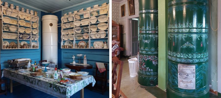 Majoittujien yhteiseen ruokailu- ja sosiaalisen kanssakäymiseen tarkoitetun puurakennuksen saimme kuulla olleen ennen Ingarskilan kyläkoulu (yläkoulu). Flyygeli ja kaksi syvänvihreää korkeaa pönttöuunia hallitsivat ruokailutilaa ja ne oli emännän toimesta koristeltu todella taidokkaasti luontoaihein. Talon siniseen ruokasaliin katetaan majoittujille toivomusten mukaisina ajankohtina (!) konstailemattomia mutta maukkaita ruokia lähiluonnon antimia hyödyntäen. Salissa on seinäntäydeltä posliinin ystäville myös silmänruokaa tarjolla. Samassa pihapiirissä oleva alakoulu puolestaan toimii isäntäparin kotina.